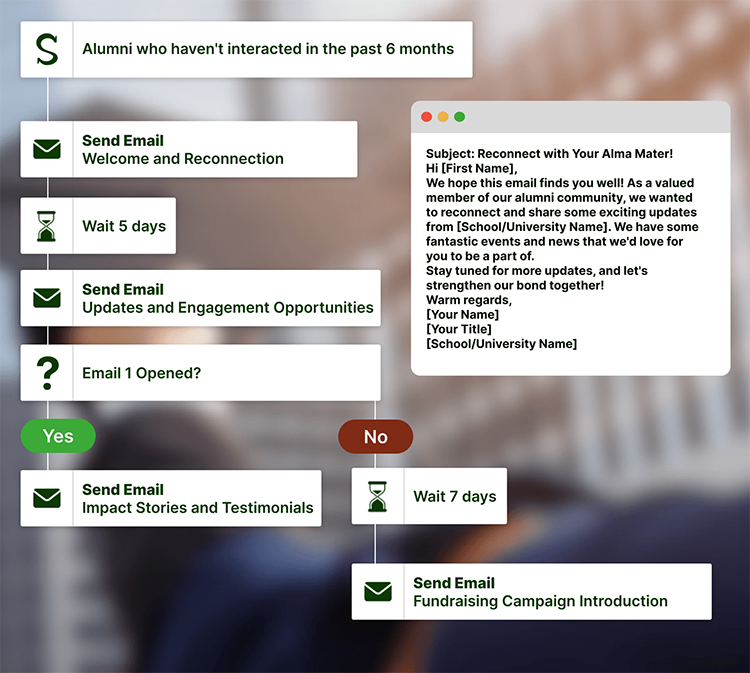 Keep alumni connected and foster a supportive community with tailored email outreach.