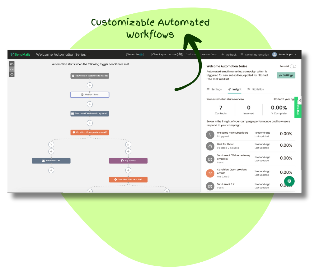 Initiate automated email conversations right after sign-up with SendMails’ easy-to-build email workflows using a drag-and-drop interface.